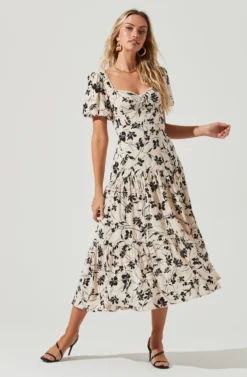 The Baldwin Dress is the occasion dress you’ve been looking for. It features a sweetheart neckline with scalloped lace trim and leads to a bustier bodice and covered front button accents. Tiered midi skirt. Short puff sleeves. Smocked back.