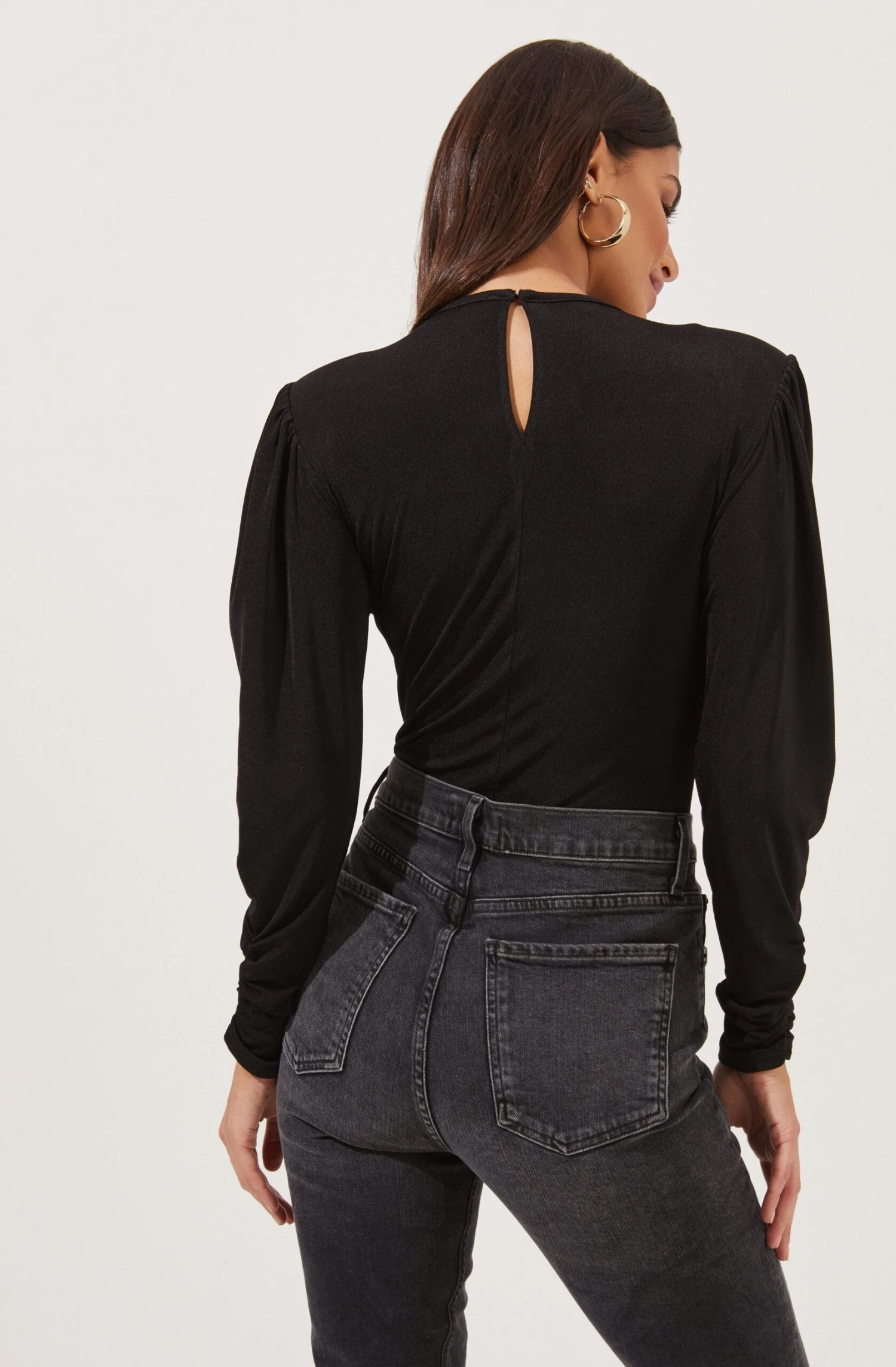 The Beckinsale Bodysuit revamps your day-to-night look. It features a round neckline that leads to a fitted bodice with draping details throughout. Long sleeves with padded shoulders. Keyhole back with button closure. Attached bottoms have snap button closures.