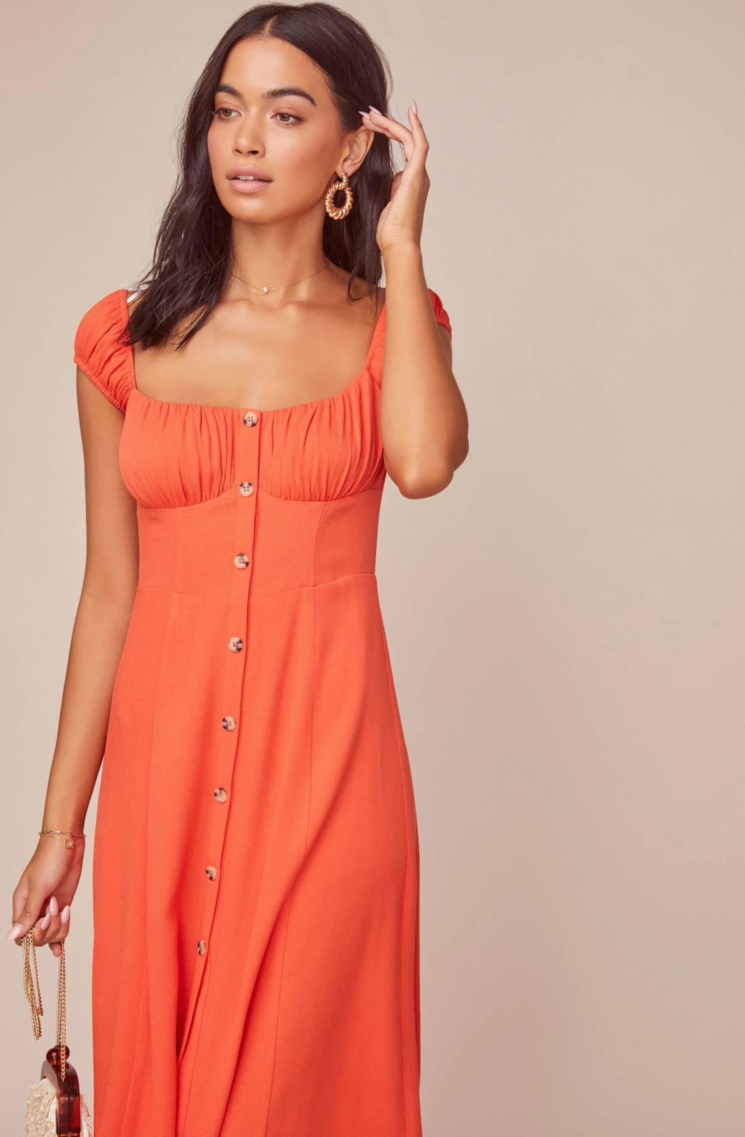 Simple and flattering, the Bonjour Midi is one look that goes with everything in your closet! It features a square neckline, short cap sleeves and a gathered bustier-style front. Button accents along the skirt and front slit detail.