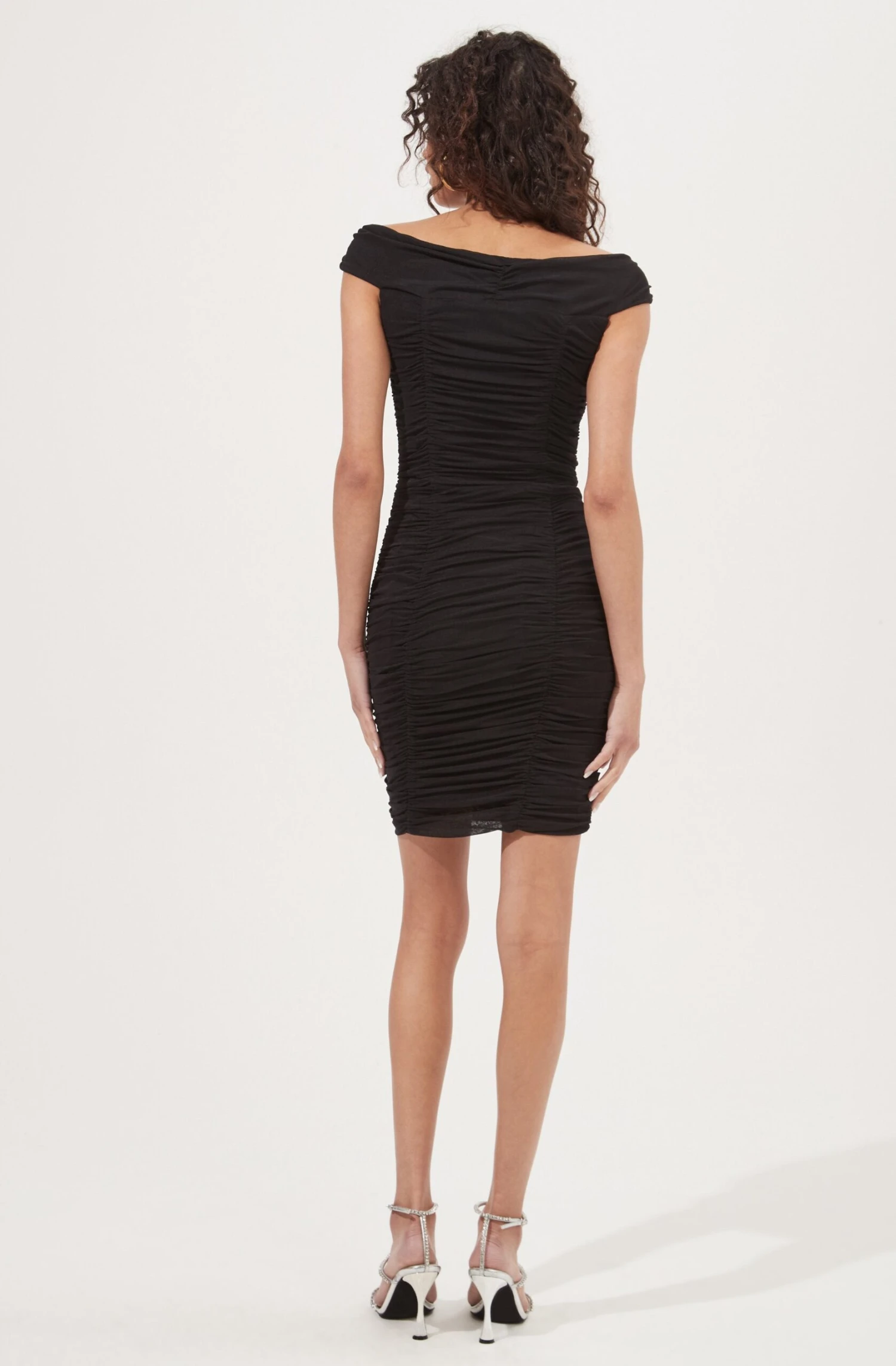 The Bradbury dress features an off-shoulder neckline that descends to a cupped bust and bodycon silhouette. Ruching throughout.