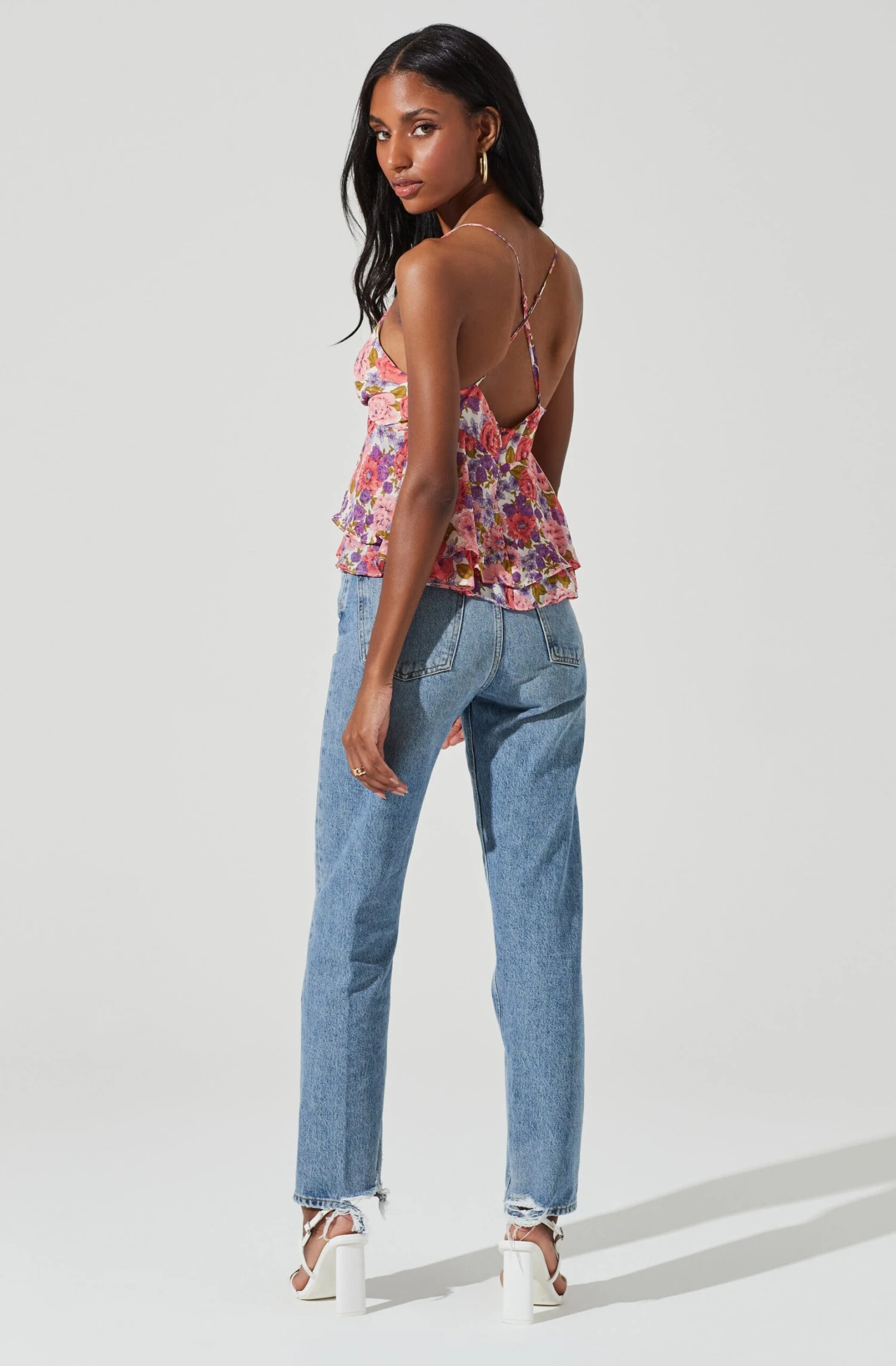 This cami features a delightful floral print throughout that goes perfectly with the season. Plunge V neckline leads to a tiered silhouette. Adjustable cross straps. Concealed back zip closure.