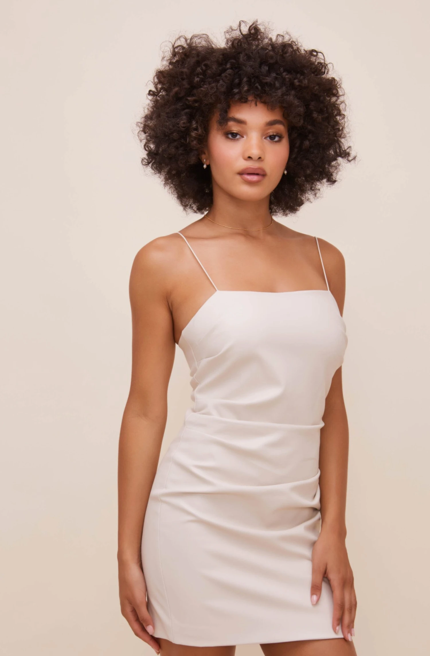 Instantly elevated. This mini dress features a faux leather construction with a square neckline supported by thin straps. Fitted silhouette features subtle ruching along the front for a more flattering fit.