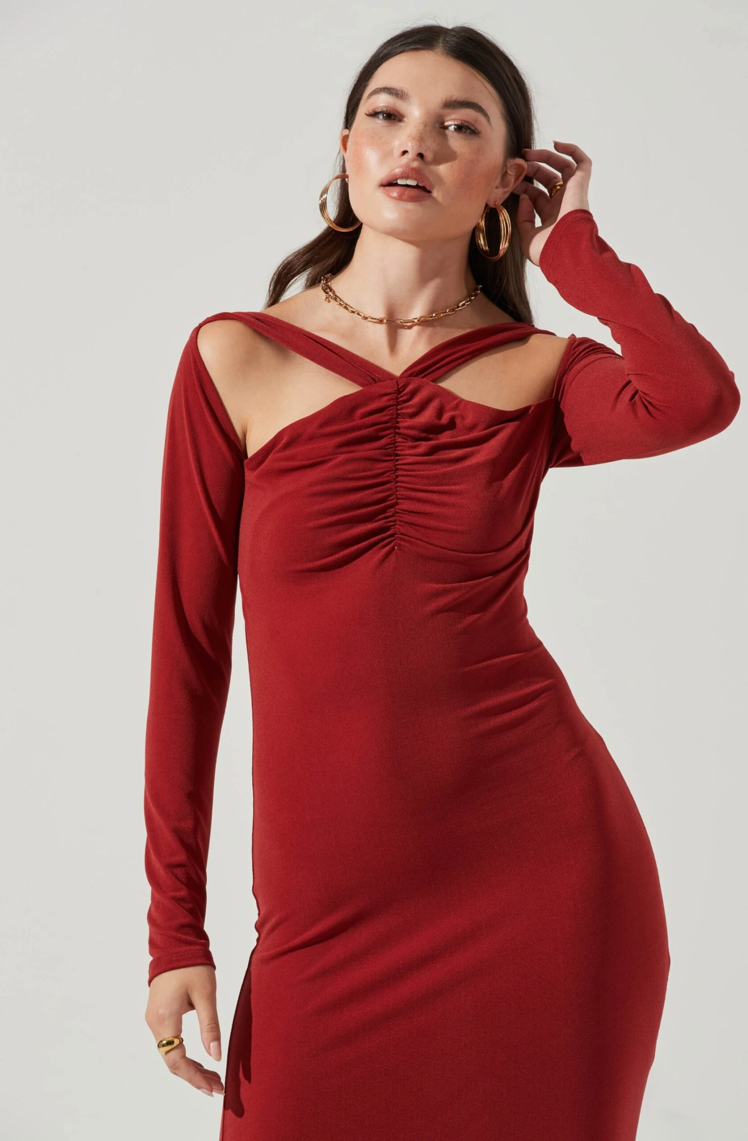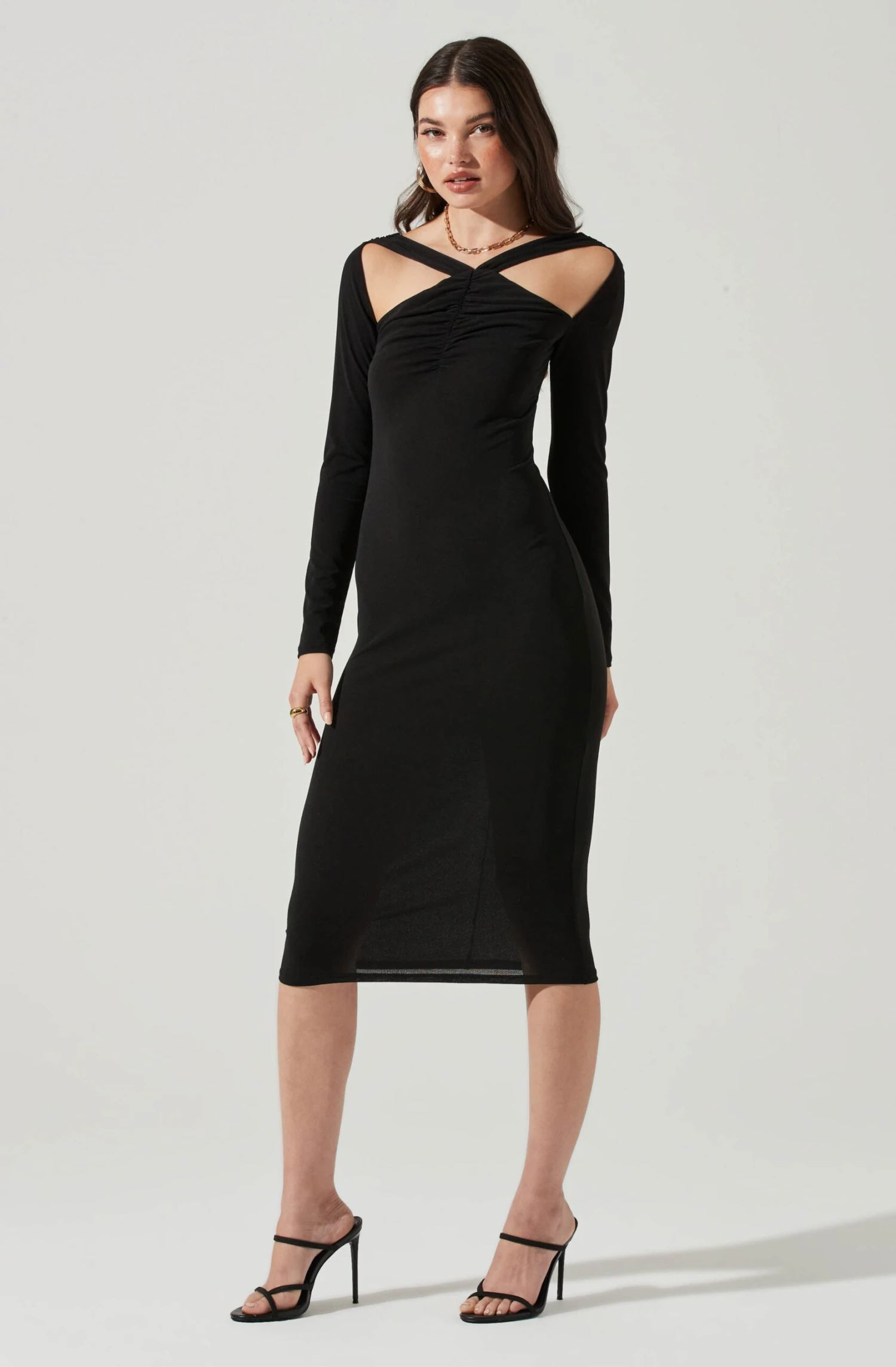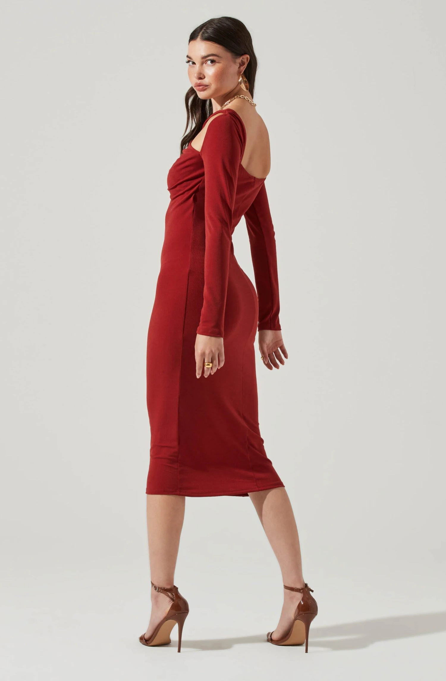 Long Sleeve Cinched Bust Cutout Midi Dress
