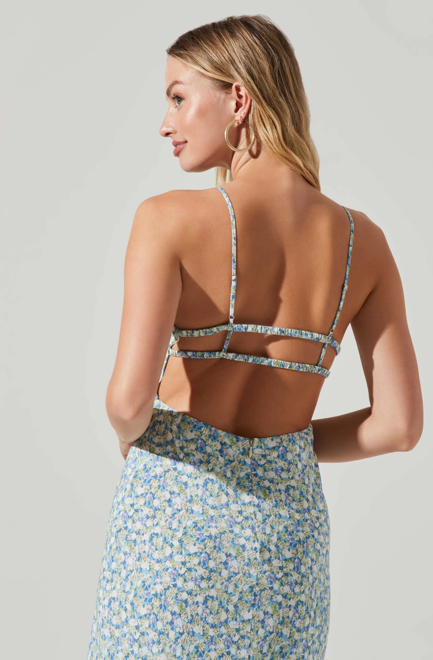 The Maritza Dress showcases a vibrant floral print. Square neckline leads to a smocked bust with a drawstring accent. Open back has supportive and adjustable straps. Midi-length skirt.