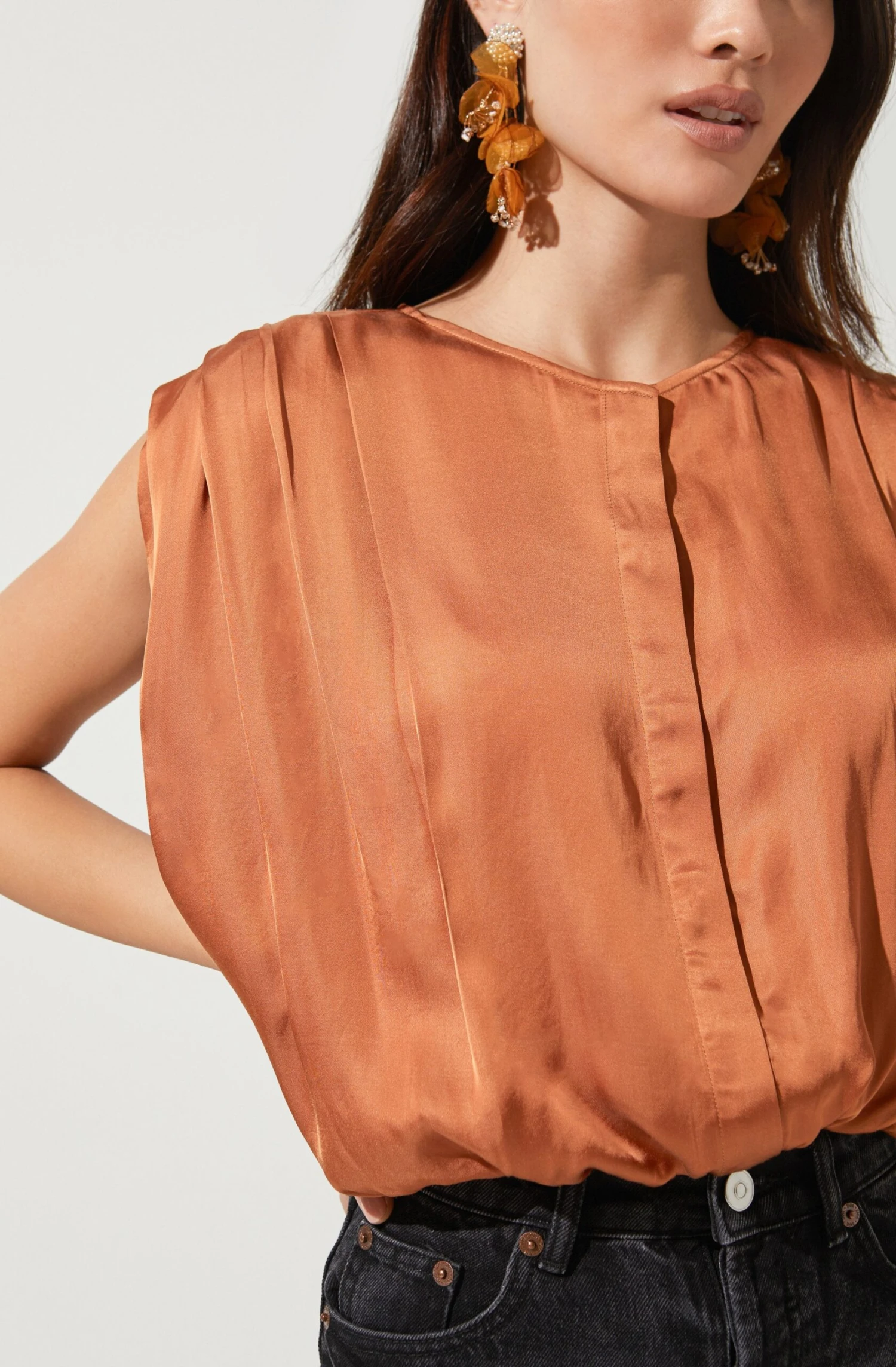 The Naoko Top features a satin-look finish with a round neckline and hidden front button placket. Relaxed silhouette with a pleated front and sleeveless design. Cinched hem.
