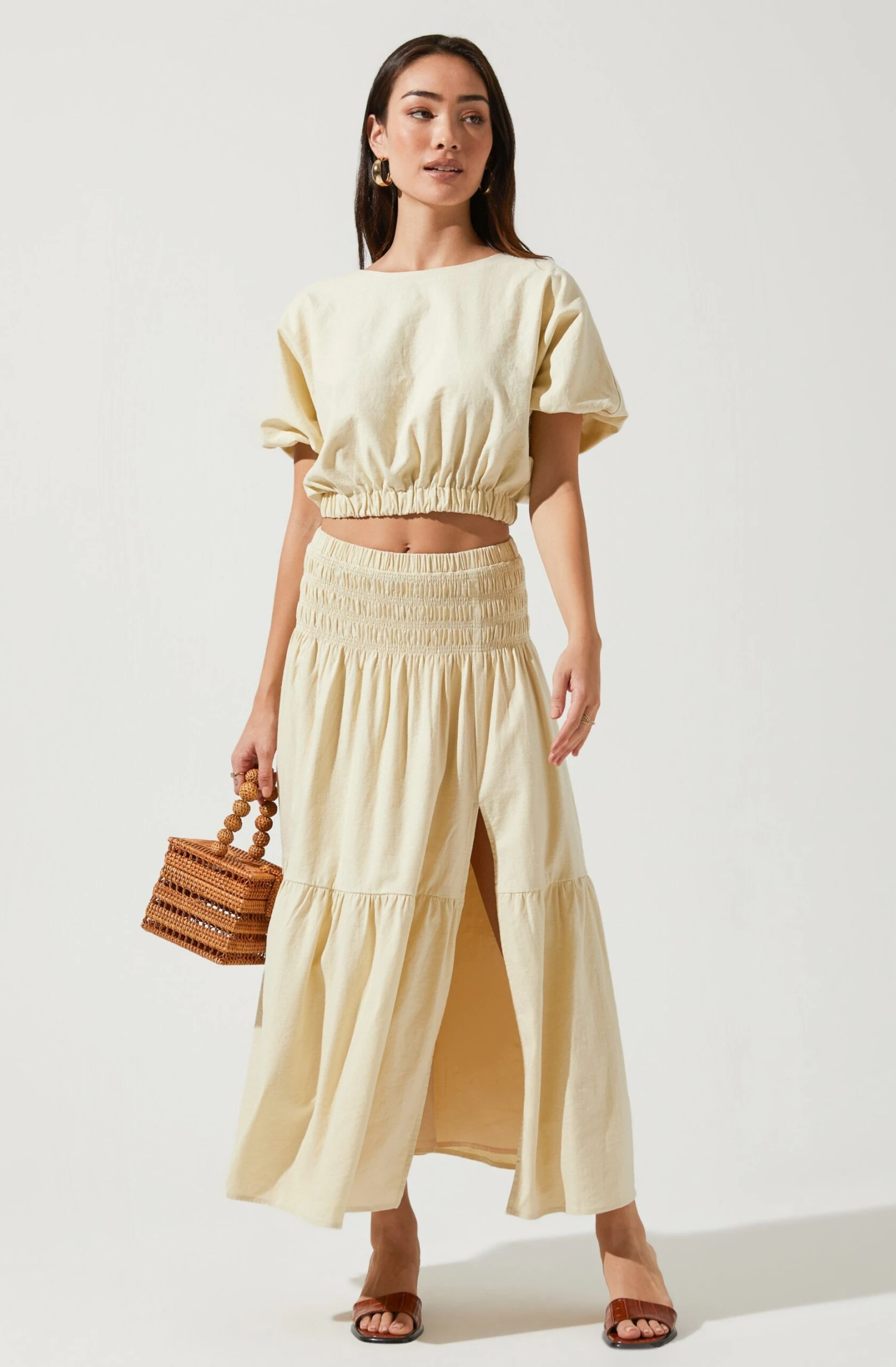 Enter a dreamy oasis. This midi skirt features a smocked waist that leads to a tiered and loose midi skirt silhouette. Front slit accent.