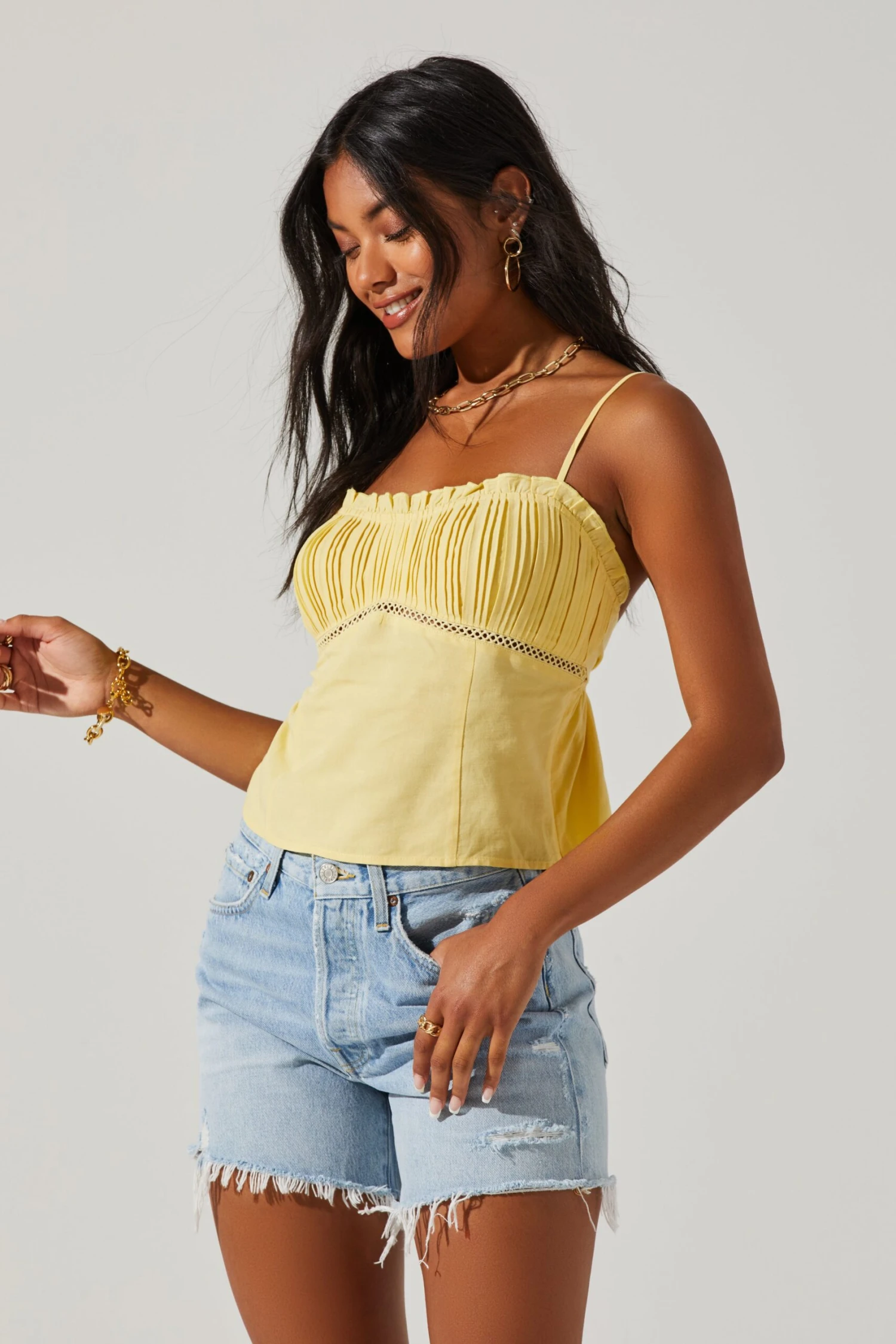 This cami features a square neckline, ruffle trim and underwired bust with pleat details. Adjustable straps. Darted bodice. Tie back accent. Concealed side zip closure.