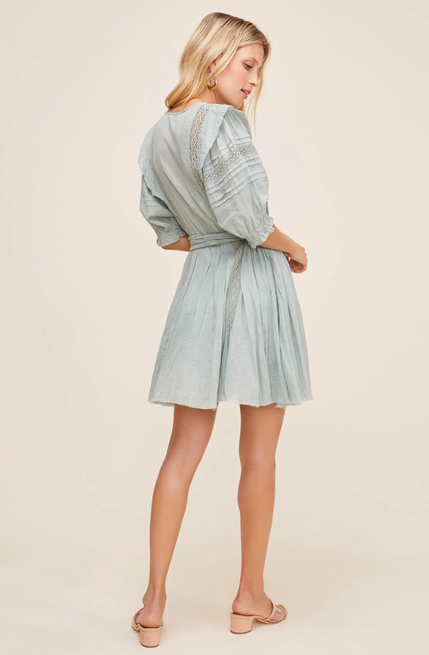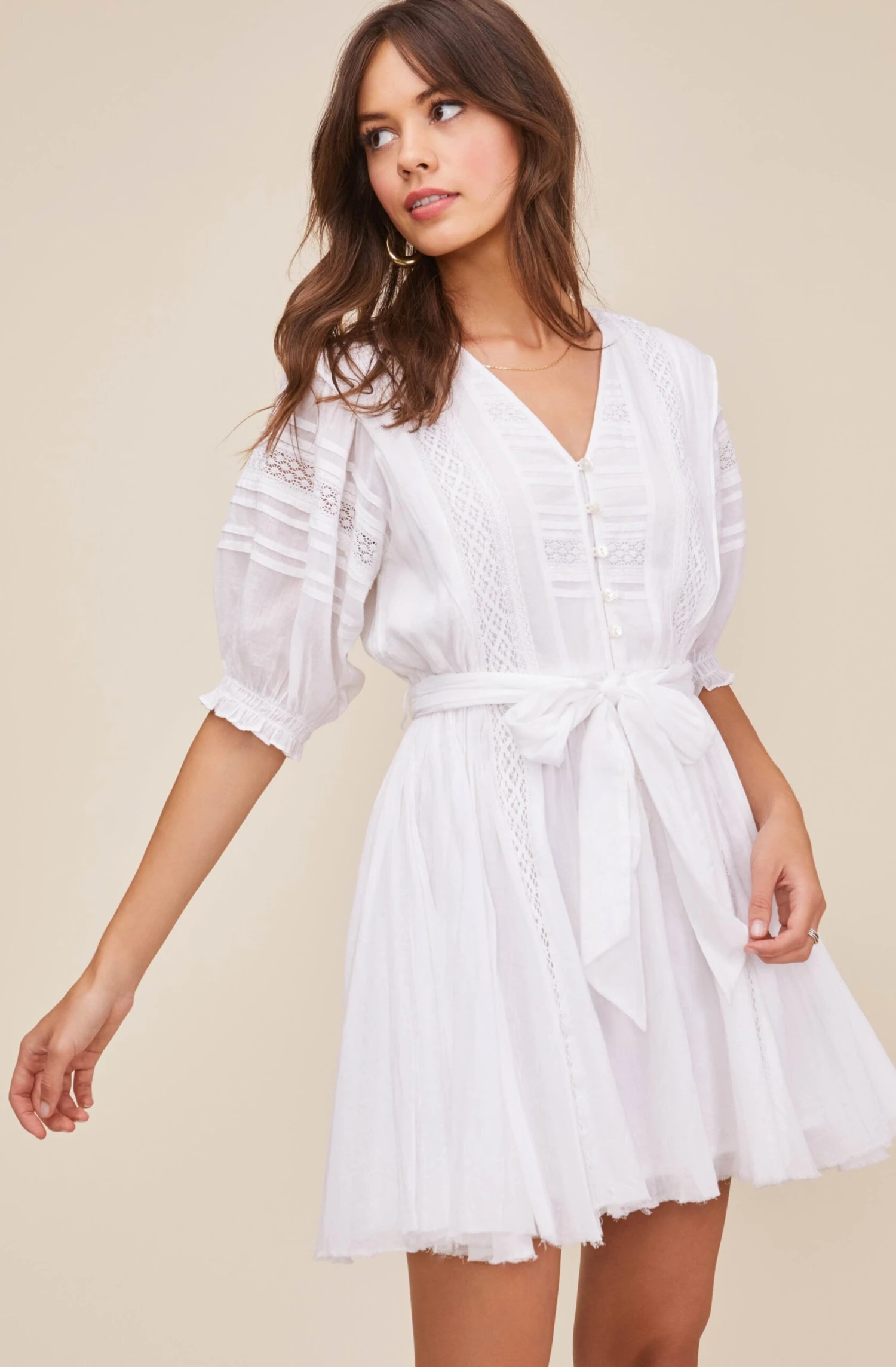 Fashion is the remedy. Flaunt your style in this unforgettable mini dress. It features a V neckline, three-quarter puff sleeves and a self-tie waist. Intricate lace details along the front complete with a front button placket.