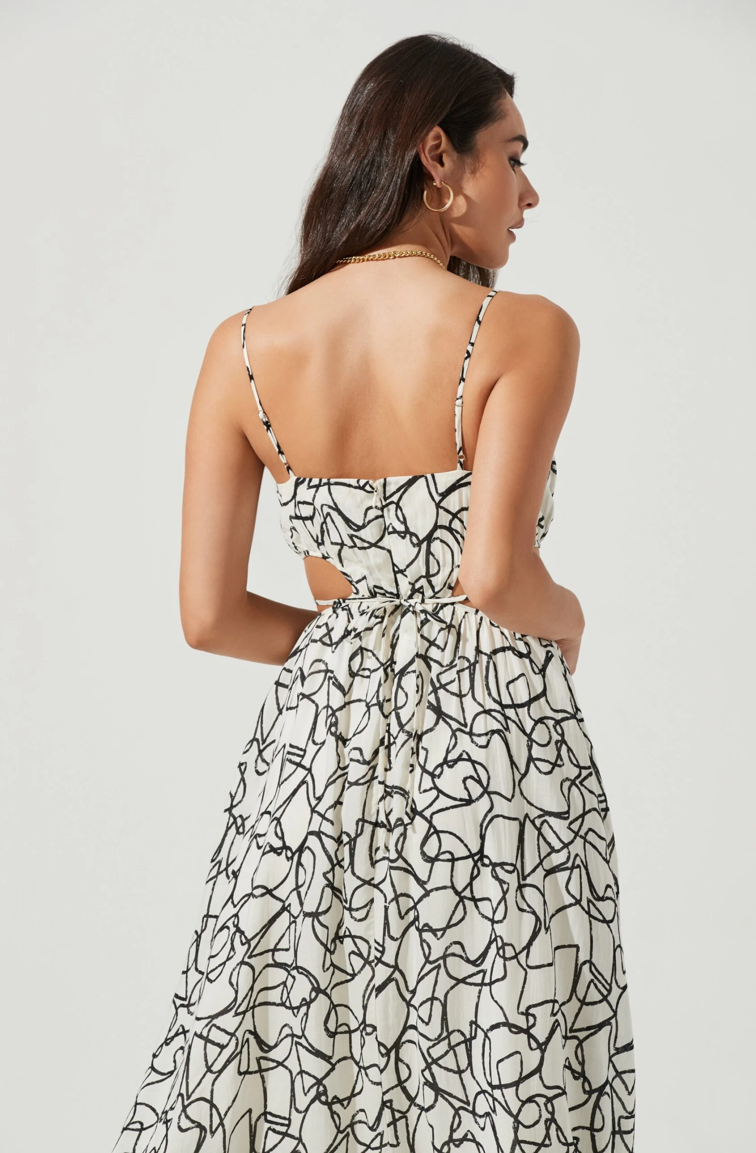 Keep it artsy in the Sanger Dress. It features a statement abstract print design throughout. Square neckline leads to a tie waist design with a cutout accent. A-line maxi skirt. Adjustable straps.