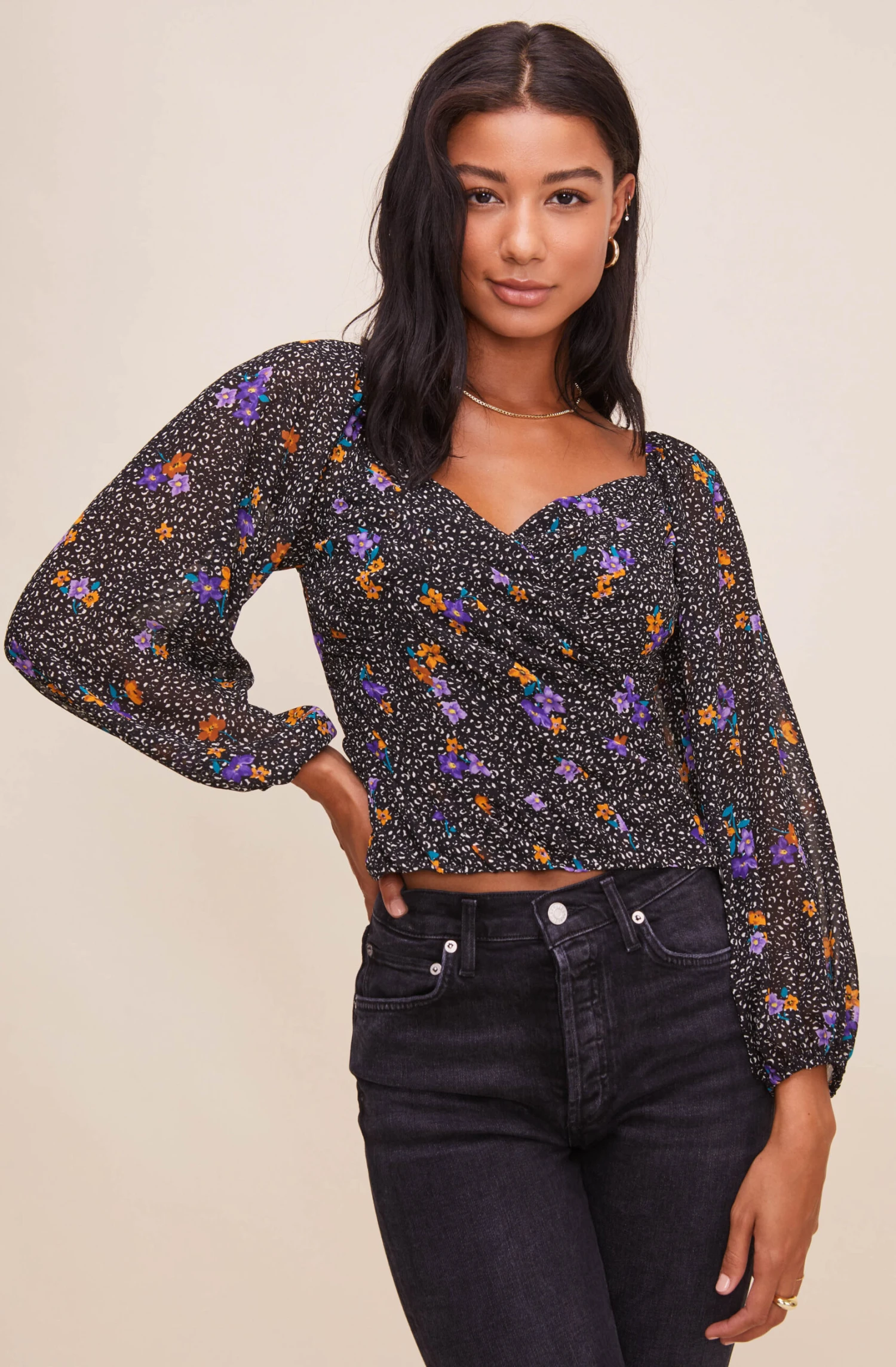 Get in the mix this fall with prints that go better together! This flattering top features a perfect mix of leopard and florals for an unexpected pattern! V neckline descends to a wrap front and fitted bodice. Long puff sleeves and shirred detailing on the back.