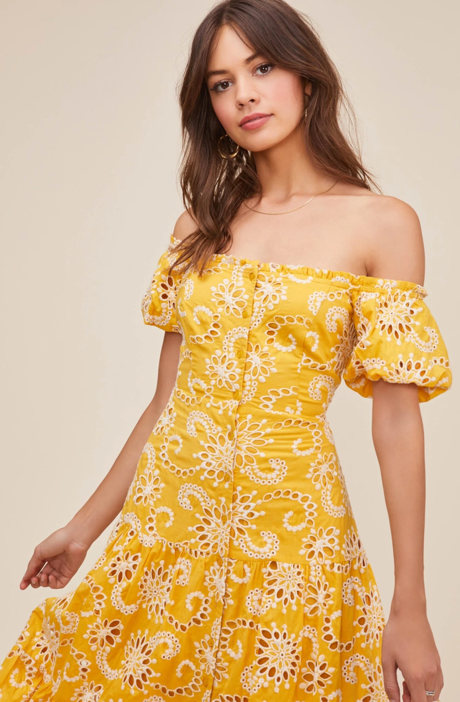 Love speaks in many languages and so does the Te Amo Dress! It features a sexy off-shoulder neckline that descends to a fitted bodice complete with a buttoned front. Tiered midi skirt features ruffle details for added romance.