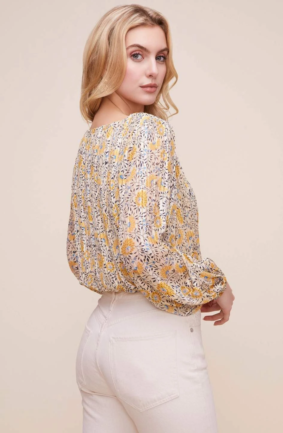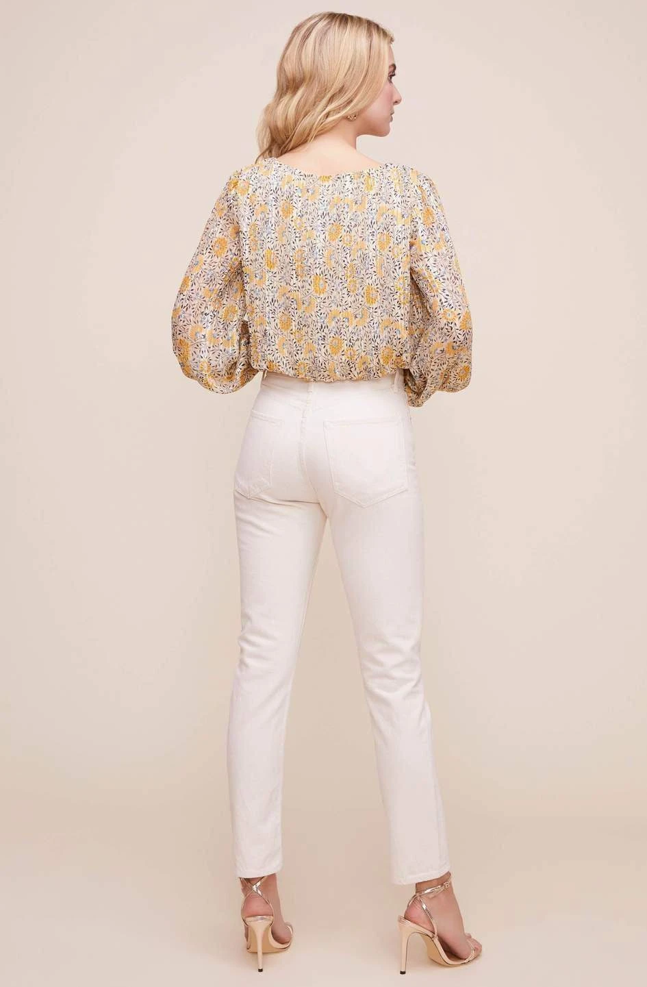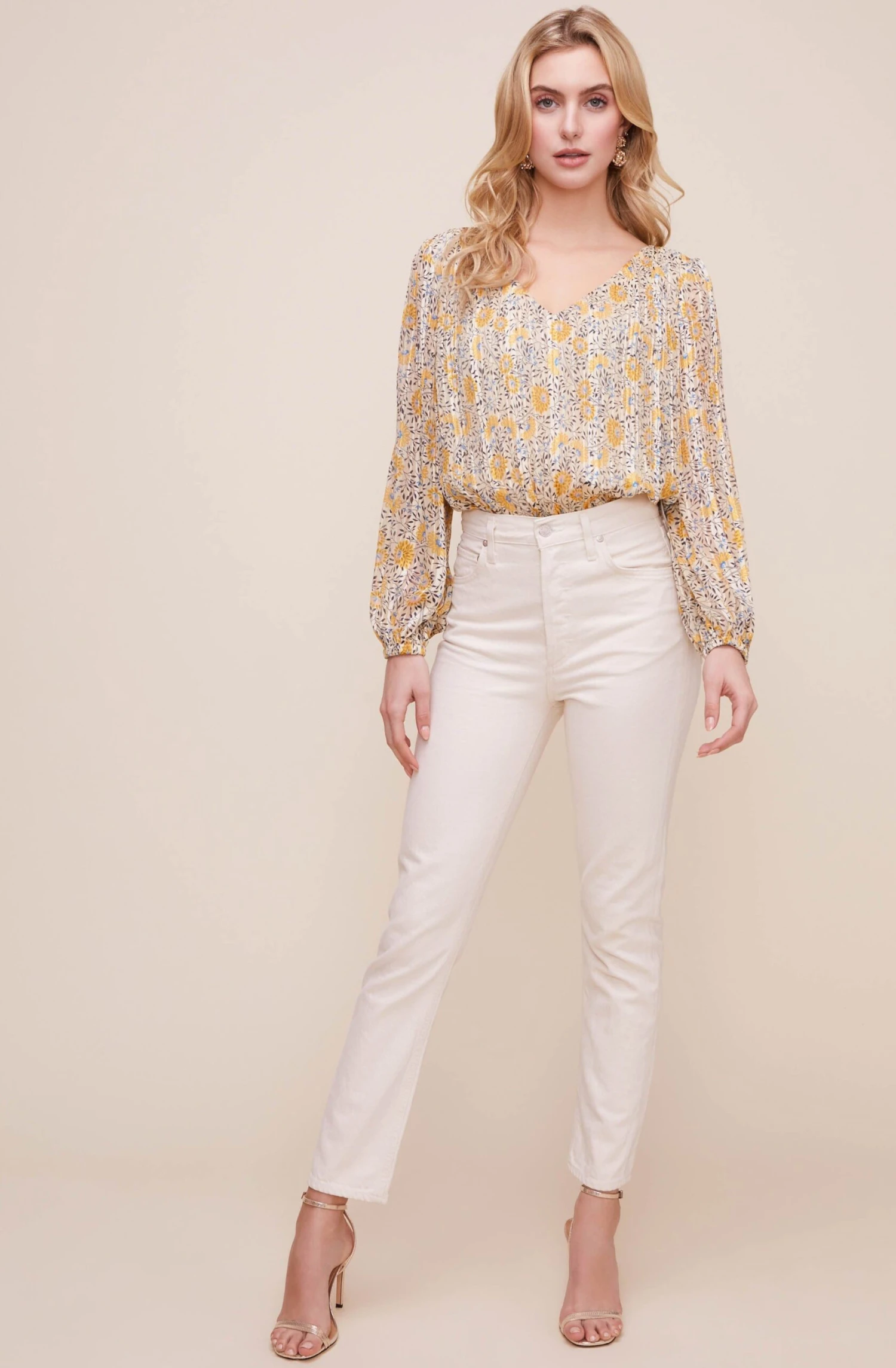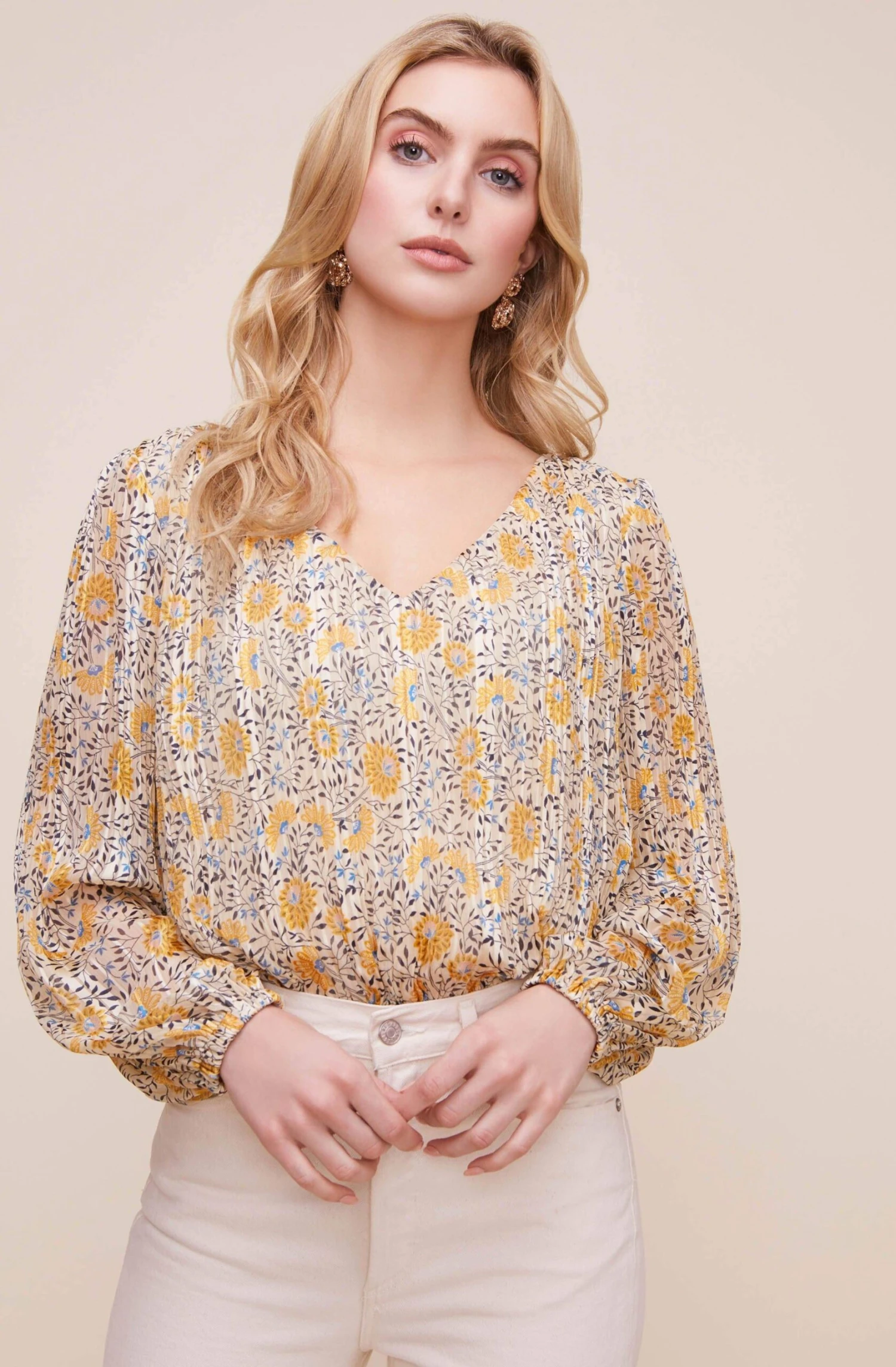 Find yourself in a dreamy landscape dressed in chic style! This top features a V neckline, relaxed fit and dainty floral print throughout. Long, statement sleeves.