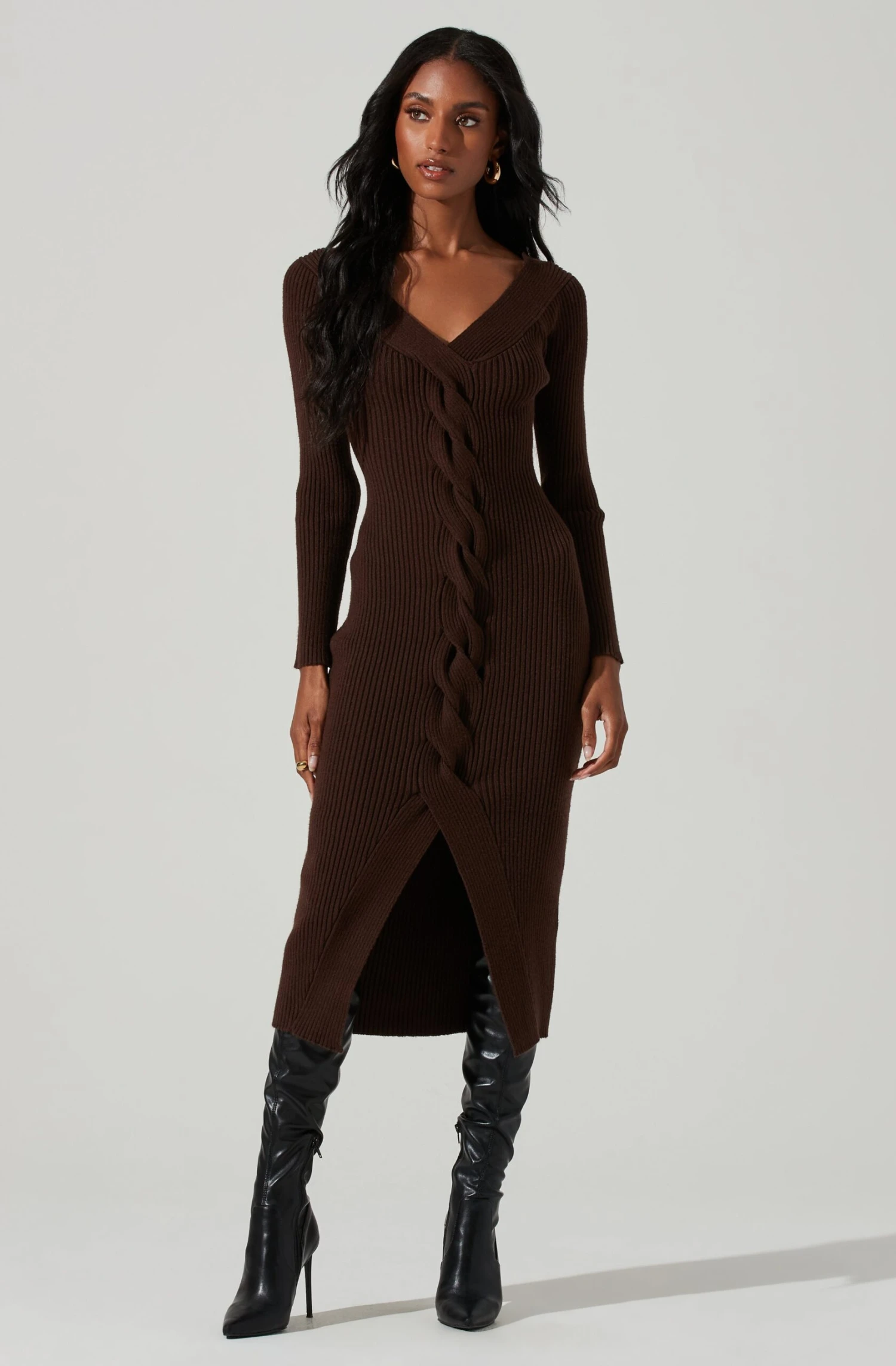 The Vesper Dress features a ribbed knit construction. V neckline leads to a cable knit trim along the front. Long sleeves. Front slit accent. Midi-length.